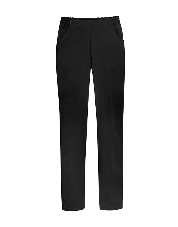 Kelnės – tiesaus silueto, juosmuo su guma. Priekyje dvi kišenės.